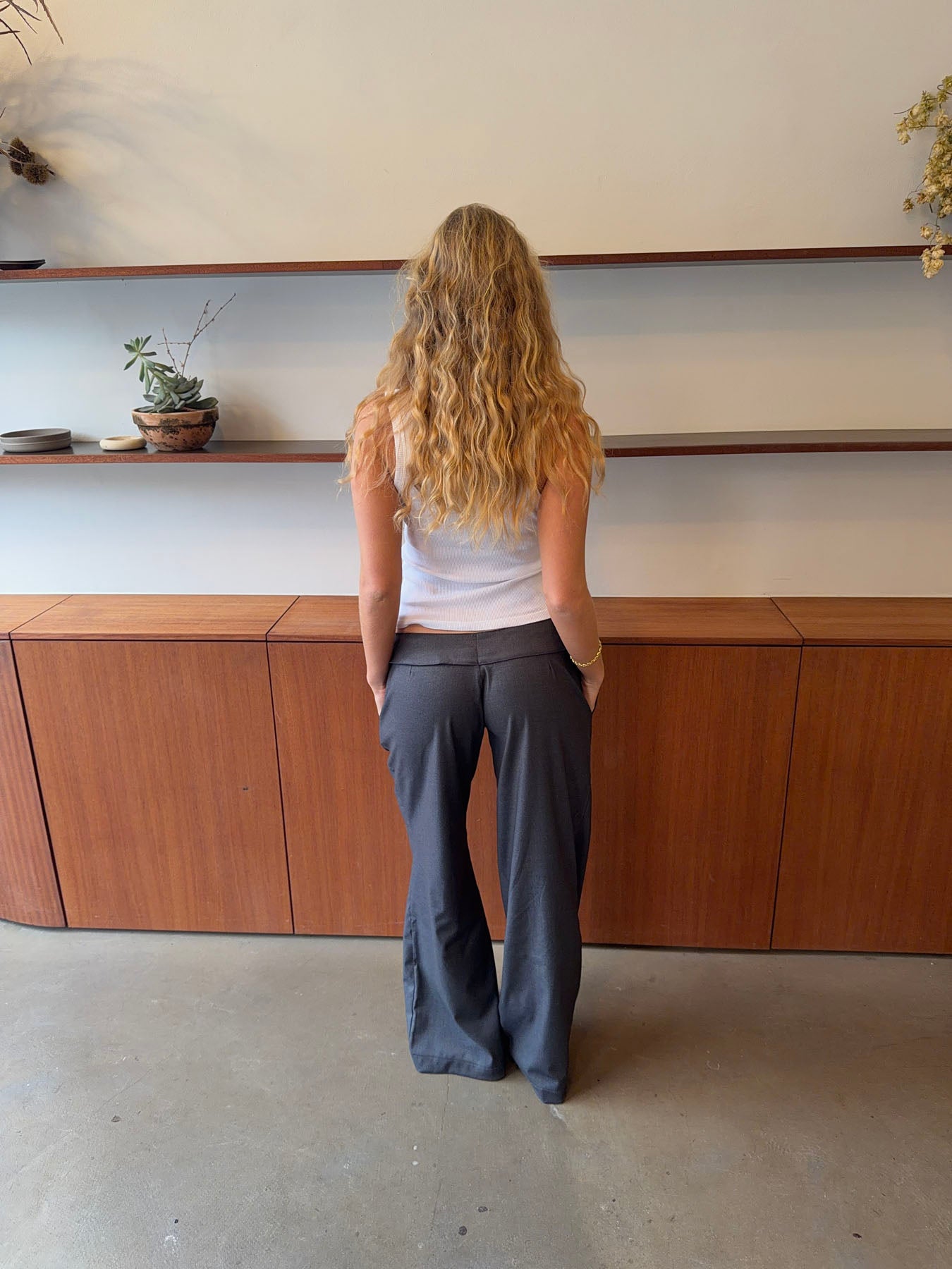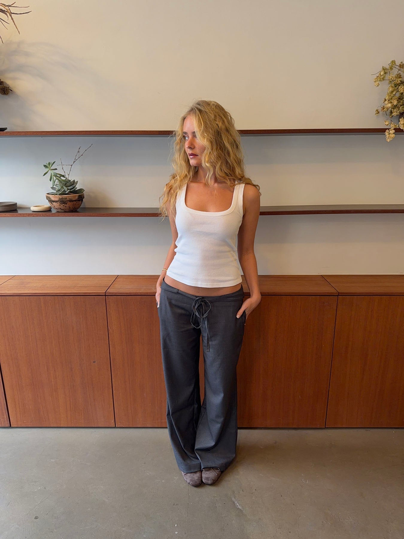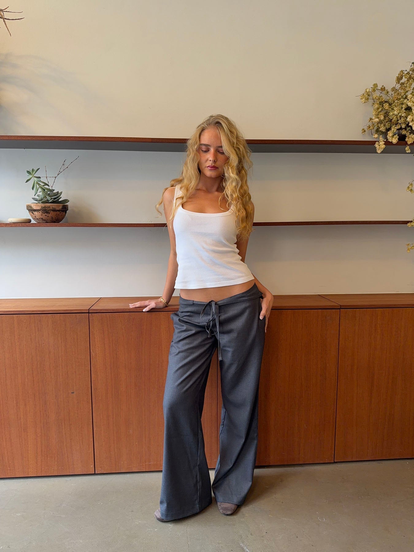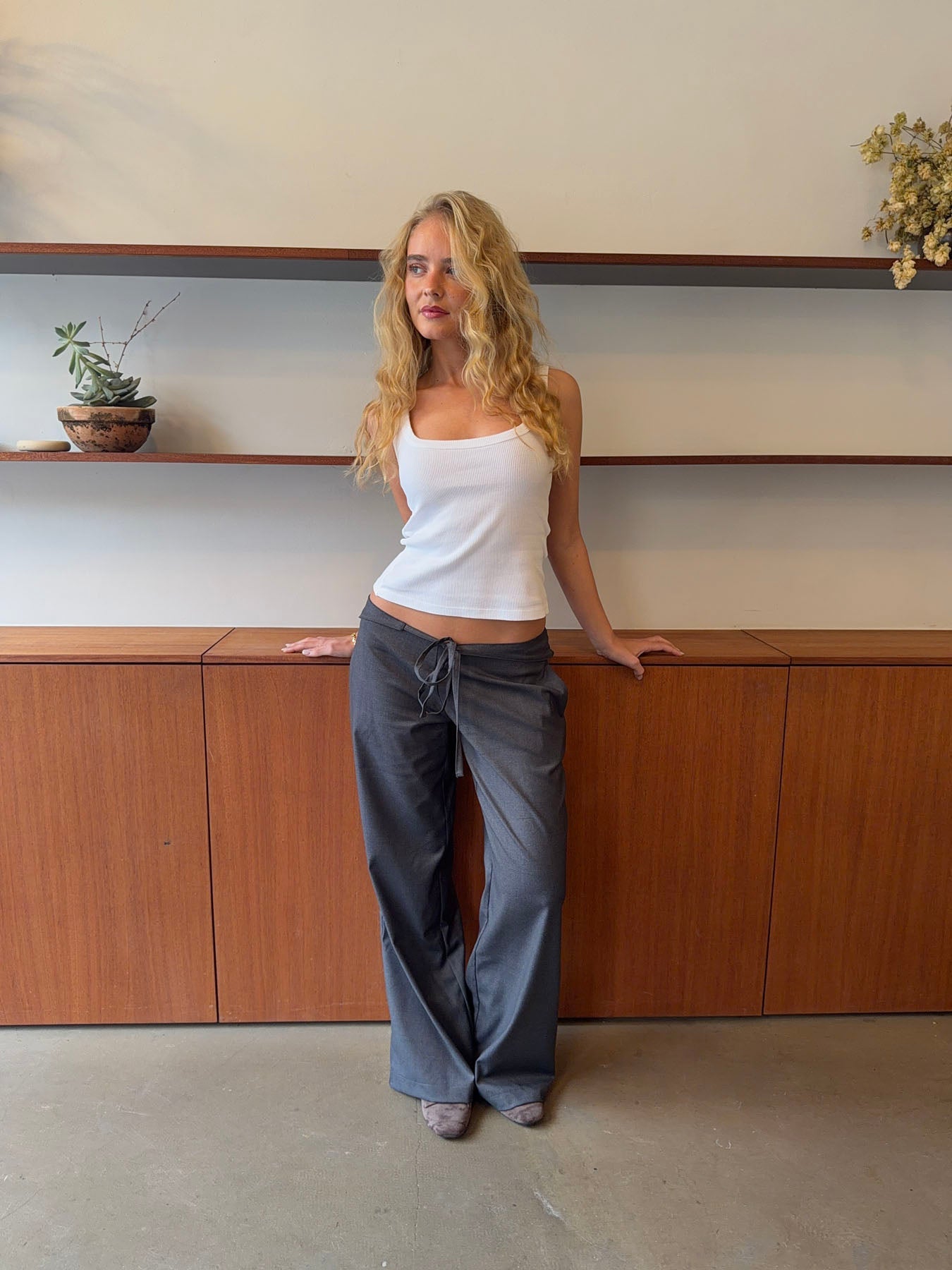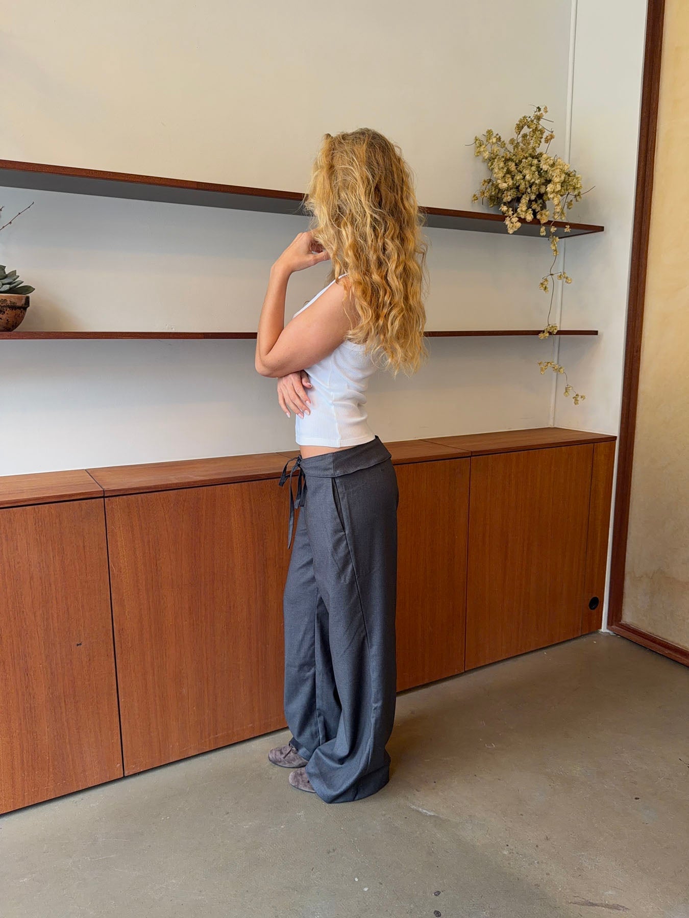 These grey trousers with a tie waist combine comfort and elegance in a timeless design. The soft, lightweight fabric drapes beautifully, creating a relaxed silhouette, while the tie detail accentuates the waist and adds a feminine touch. The straight legs offer a clean, modern look that makes the trousers versatile – perfect for both the office and casual days. Style them with a simple top or shirt for an effortless, refined look.
