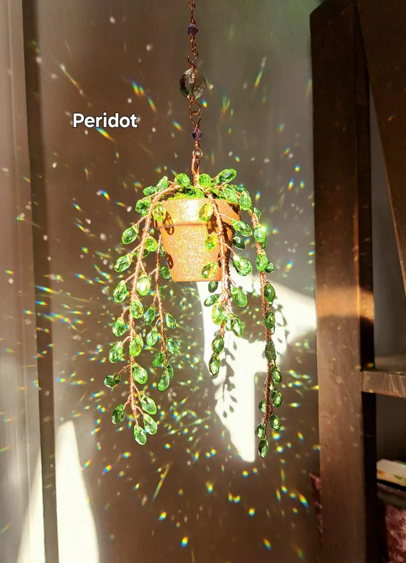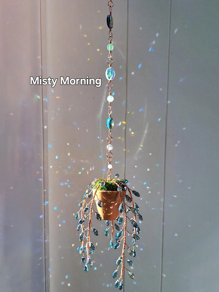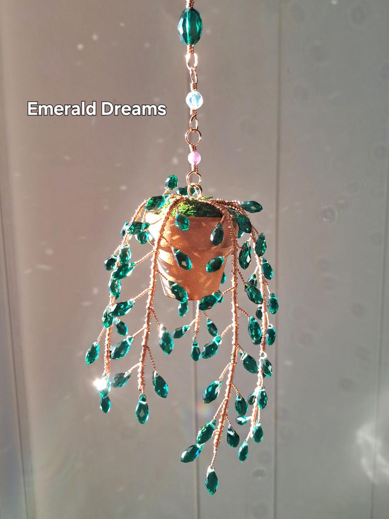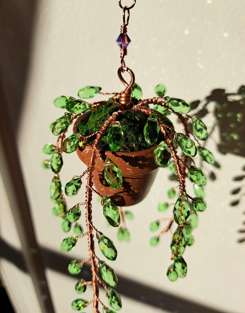 Each forever succulent features 5 branches of succulent leaves that are created with faceted glass teardrop beads and pure copper wire. The succulent sits inside of a 1 1/2″ terra-cotta pot that has been lightly coated with a shimmer rainbow glitter spray paint and has a pretty layer of moss inside. The pot hangs from a beaded chain that is created by individually wire wrapping glass and crystal beads together. The top of the chain has a loop so you can easily hang the succulent in a sunny window for maximum rainbows.?