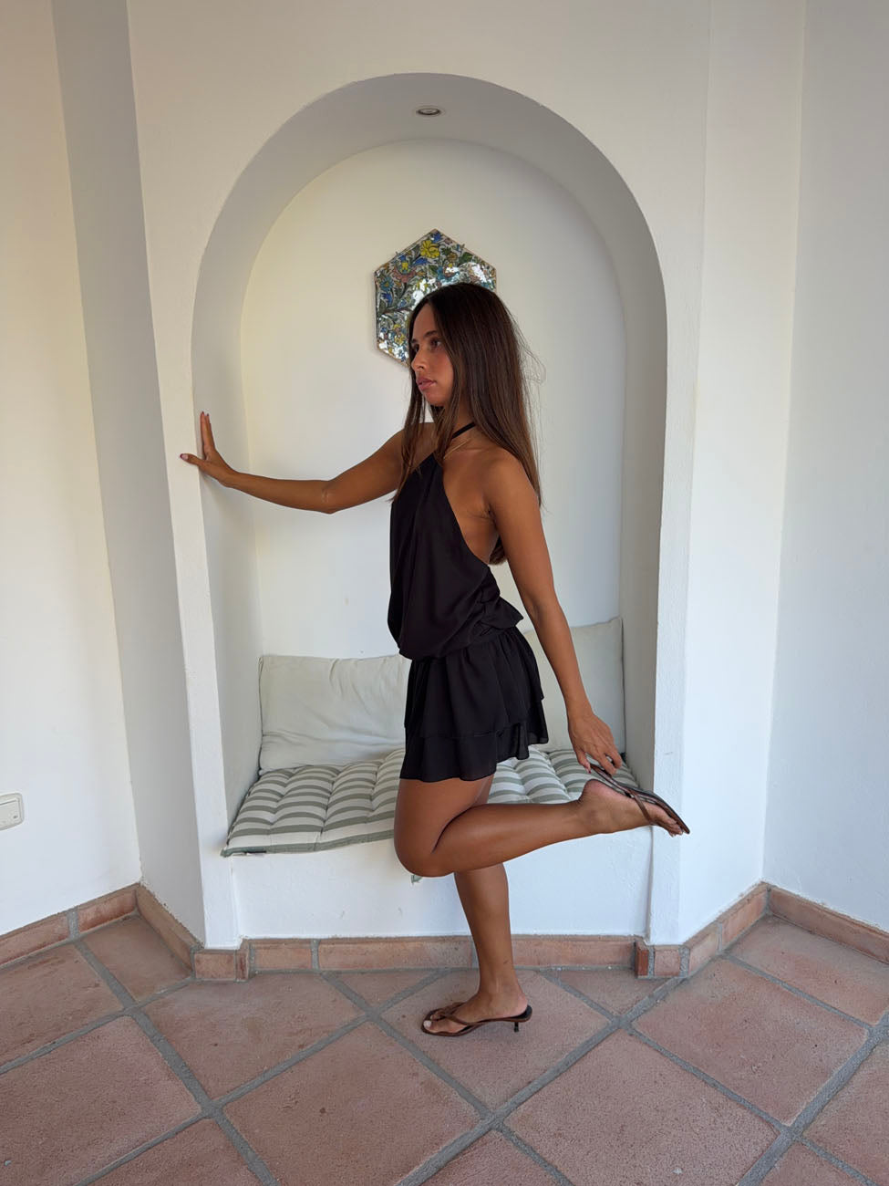 A beautiful and eye-catching dress in black chiffon featuring an elegant halterneck strap and a lightly draped silhouette. The top has a modern, feminine expression with a flowing ruffle detail that adds volume and movement. Perfect for both evening looks and festive occasions.?Style it with jeans for a cool contrast look or with a long skirt for an elegant outfit.