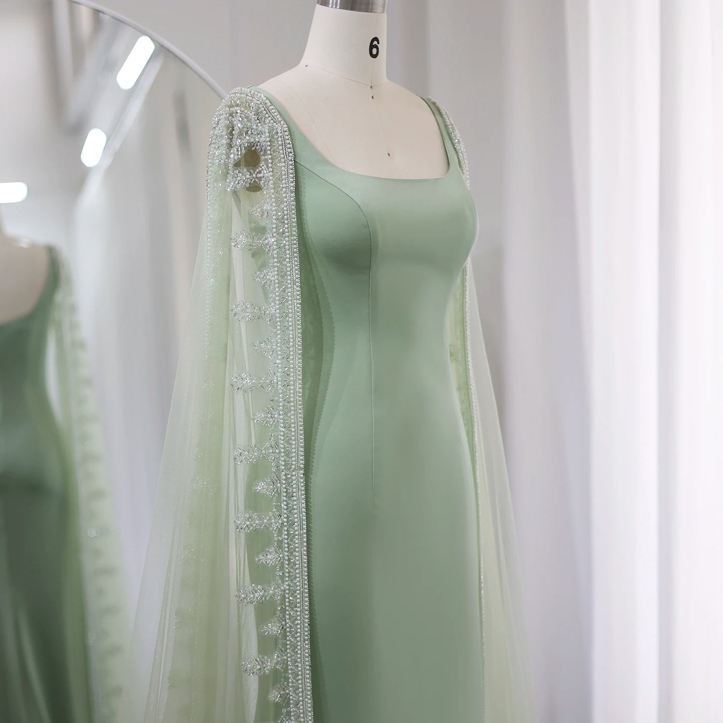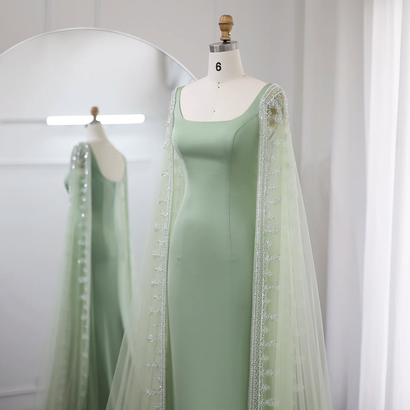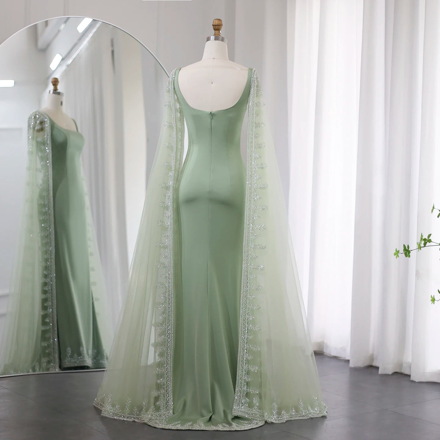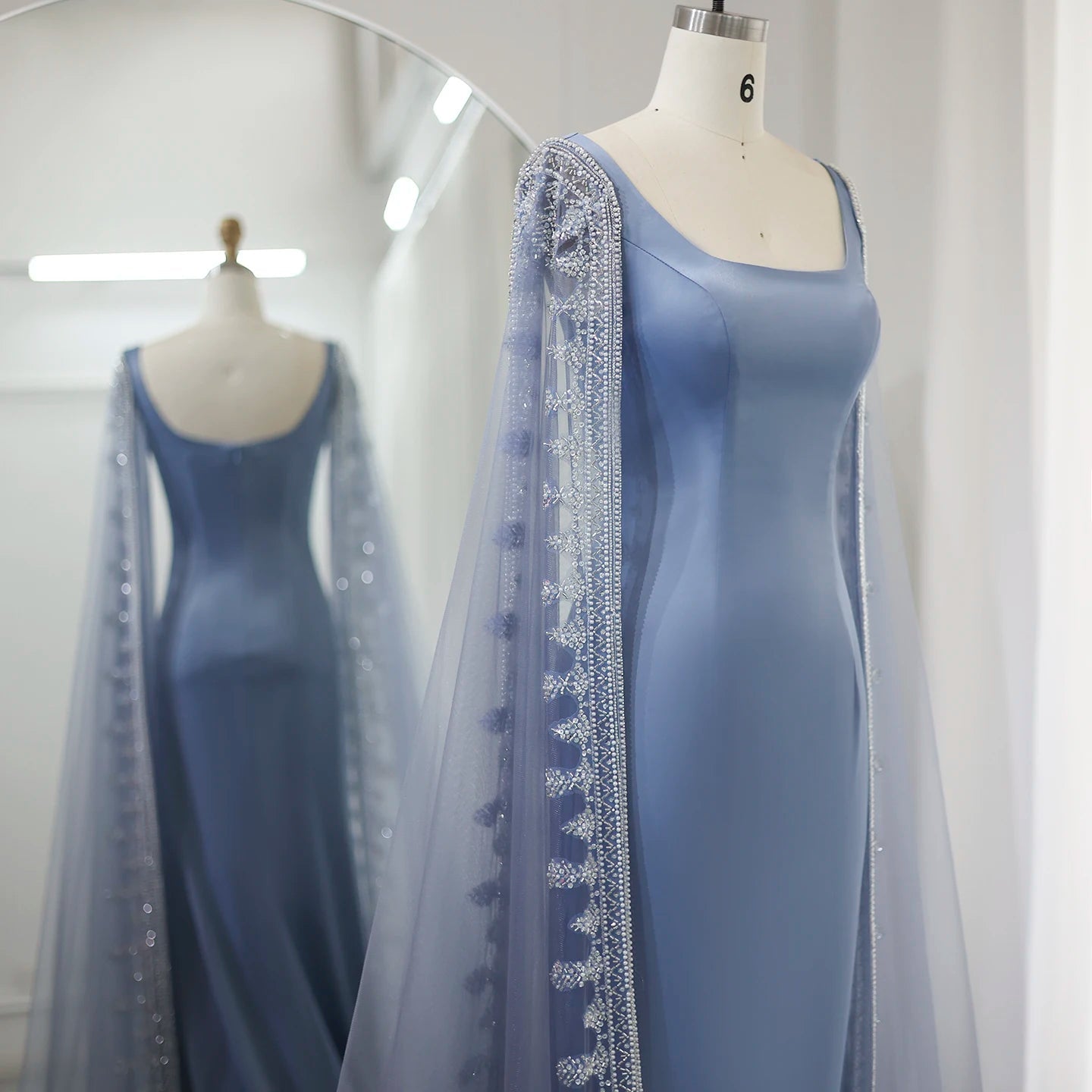 Introducing the Dreamy Vow Luxury Crystal Blue Mermaid Dubai Evening Dresses with Cape Sleeves Elegant Arabic Women Wedding Party Gowns 445. Elevate your evening look with this stunning and sophisticated dress, featuring intricate crystal details and a flattering mermaid silhouette. Perfect for weddings, galas, and other special occasions.