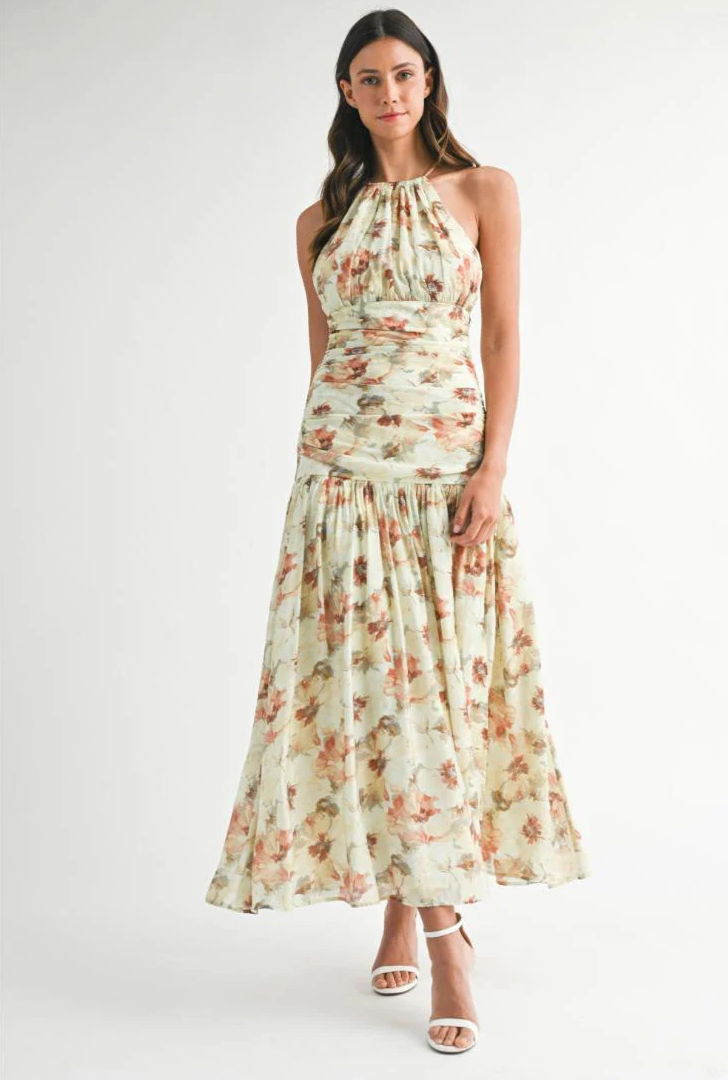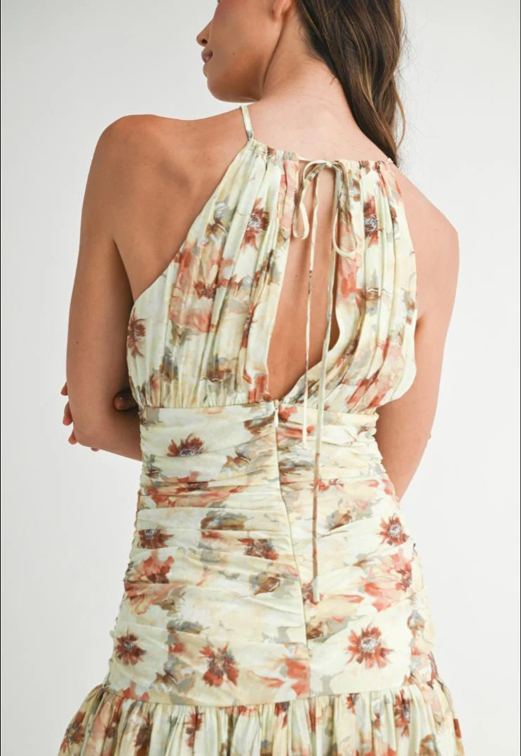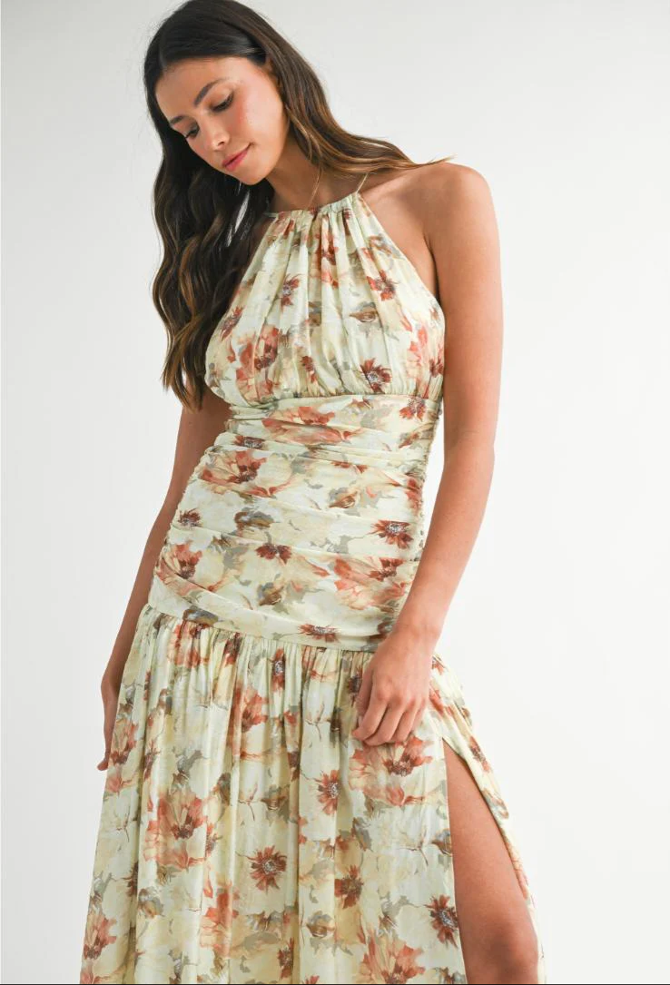 Summer Floral Print Ruched Halter Midi Dress