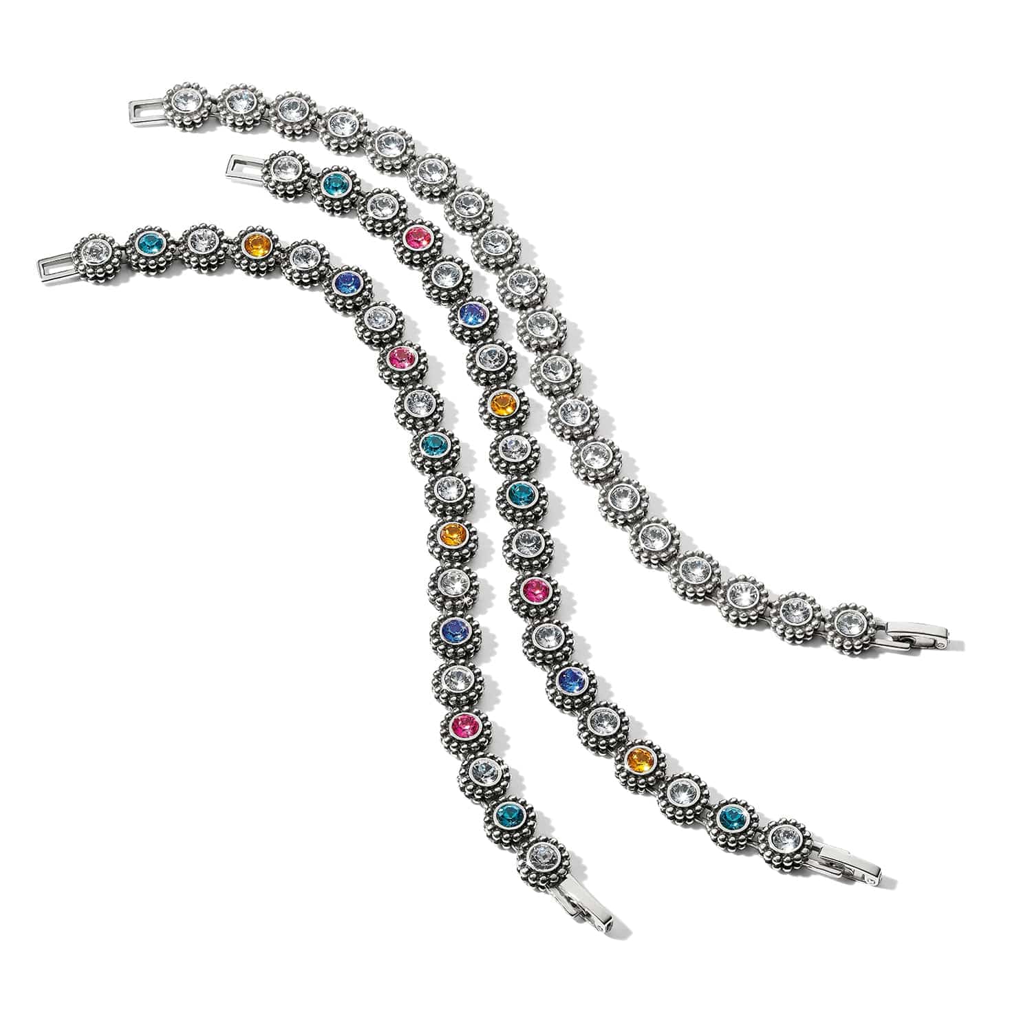 Balinese silver granulation frames shimmering hand-set crystals for a look that complements jeans and white shirts to little black dresses.