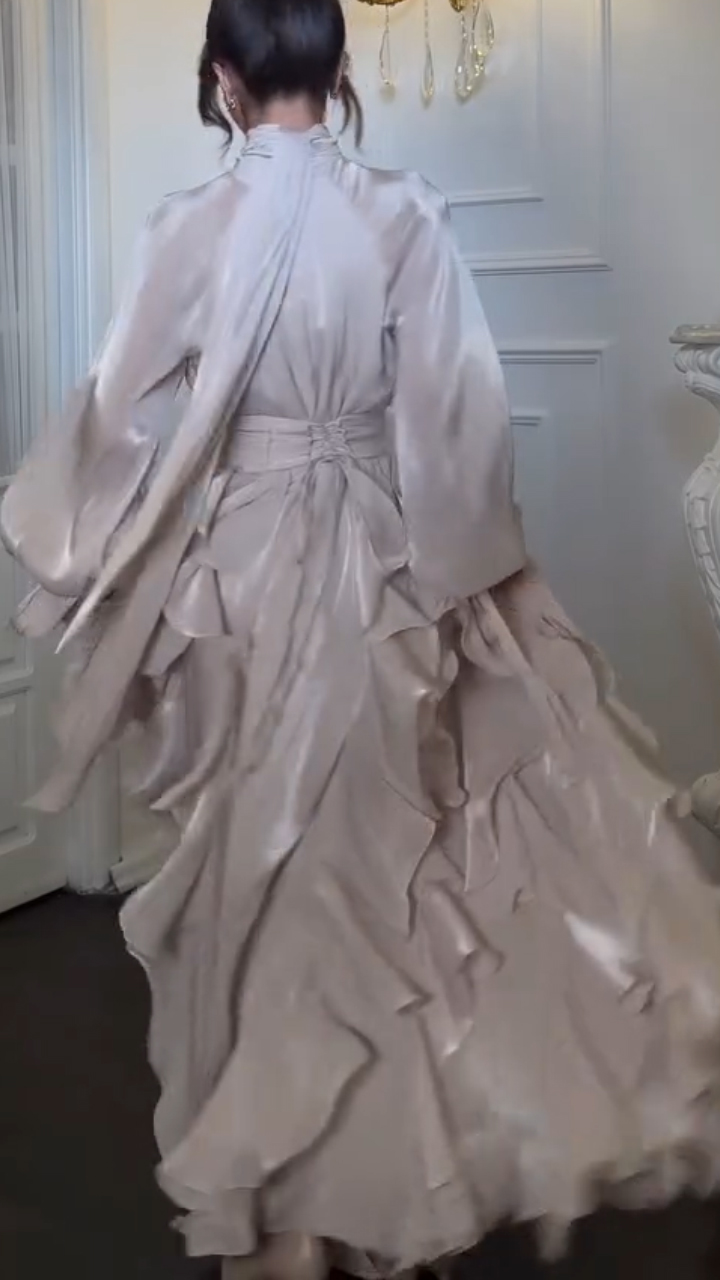The gown begins with a high – necked bodice that exudes sophistication. The neckline is structured, yet the fabric around it cascades into soft pleats that add movement and a touch of drama. This high neckline frames the face beautifully, drawing attention to the wearer’s features while maintaining an air of mystery. The long, billowing sleeves are a standout detail??they are voluminous, with a slight sheen that catches the light as the wearer moves. These sleeves give the gown a sense of old – world glamour, reminiscent of the flowing garments worn by royalty in bygone eras. The cuffs of the sleeves are gently gathered, adding to their ethereal quality and ensuring they don’t overwhelm the overall silhouette.